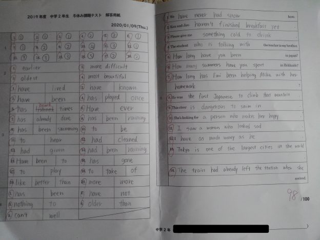 (中1、1学期から定期考査ほぼ満点)のテストの写真も掲載します。