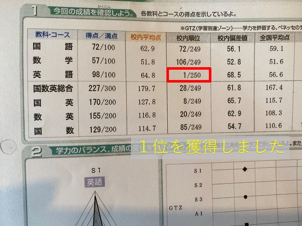 当会の中2生(新中3)がベネッセ模試で1位、駿台模試で6位の報告を受けました。